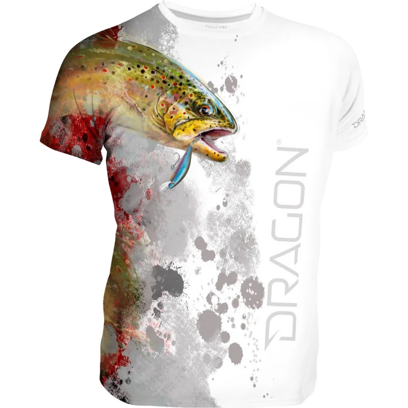 T-shirt Pstrąg to koszulka z krótkim rękawem typu raglan. Komfortowa odzież wędkarska z cienkiego poliestru. Materiał przepuszcza powietrze i jest szybkoschnący. Nadruk ryby pstrąg jest trwały i niezwykle realistyczny. Odważne wzornictwo dla pogromcy drapieżników.