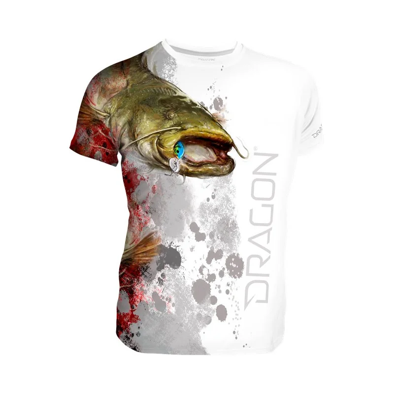 T-shirt Sum - Biały to koszulka z krótkim rękawem typu raglan. Komfortowa odzież wędkarska z cienkiego poliestru. Materiał przepuszcza powietrze i jest szybkoschnący. Nadruk ryby sum jest trwały i niezwykle realistyczny. Odważne wzornictwo dla pogromcy drapieżników.