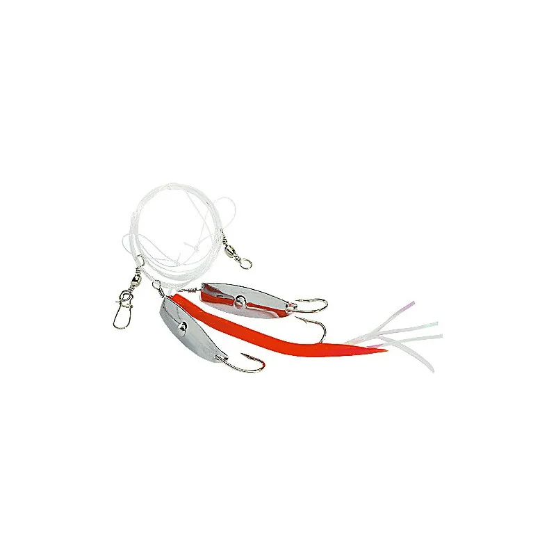 Zestaw do łowienia dorszy. Przywieszka firmy Jaxon wyposażona w dwie przywieszki jedna kształtem przypominająca tubisa druga blaszka z wtopionym hakiem imitująca śledzia. Jest to jeden z klasyków na polskim wybrzeżu świetnie sprawdza się, kiedy dorsz żeruje w pełni i pobiera pokarm nad dnem żerując na śledziu. Blaszka może okazać się kilerem dnia jej błysk potrafią z furią atakować wątłusze w pobliżu naszego zestawu.